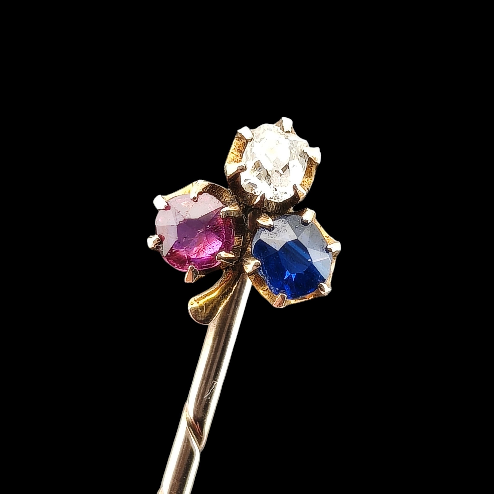 A stunning late Victorian to Edwardian era stick or tie pin, the head featuring an old cut diamond, ruby and sapphire in the shape of a shamrock clover, the stones claw set in 18 carat yellow gold and set upon a 9 carat yellow gold pin. A gorgeous antique piece which can be pinned to the lapel of a jacket, on a tie or almost any piece of clothing.