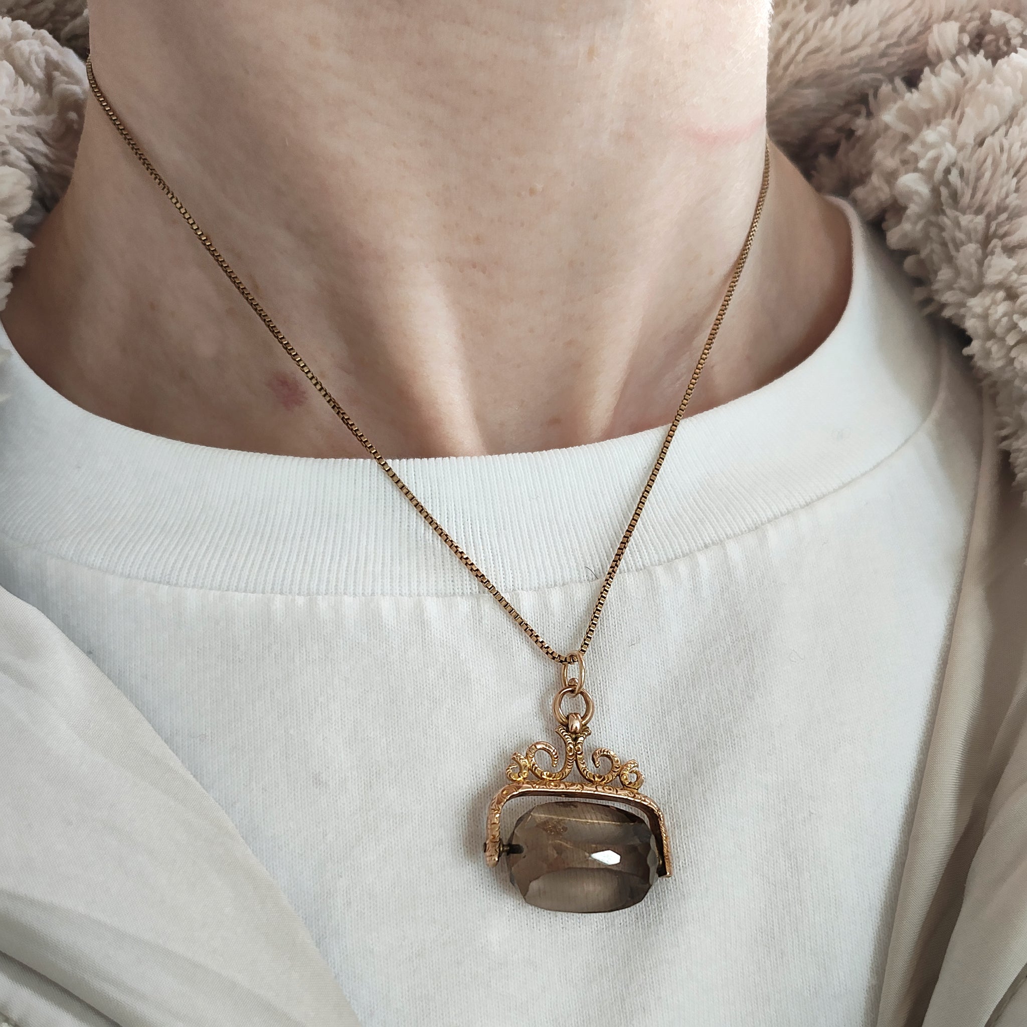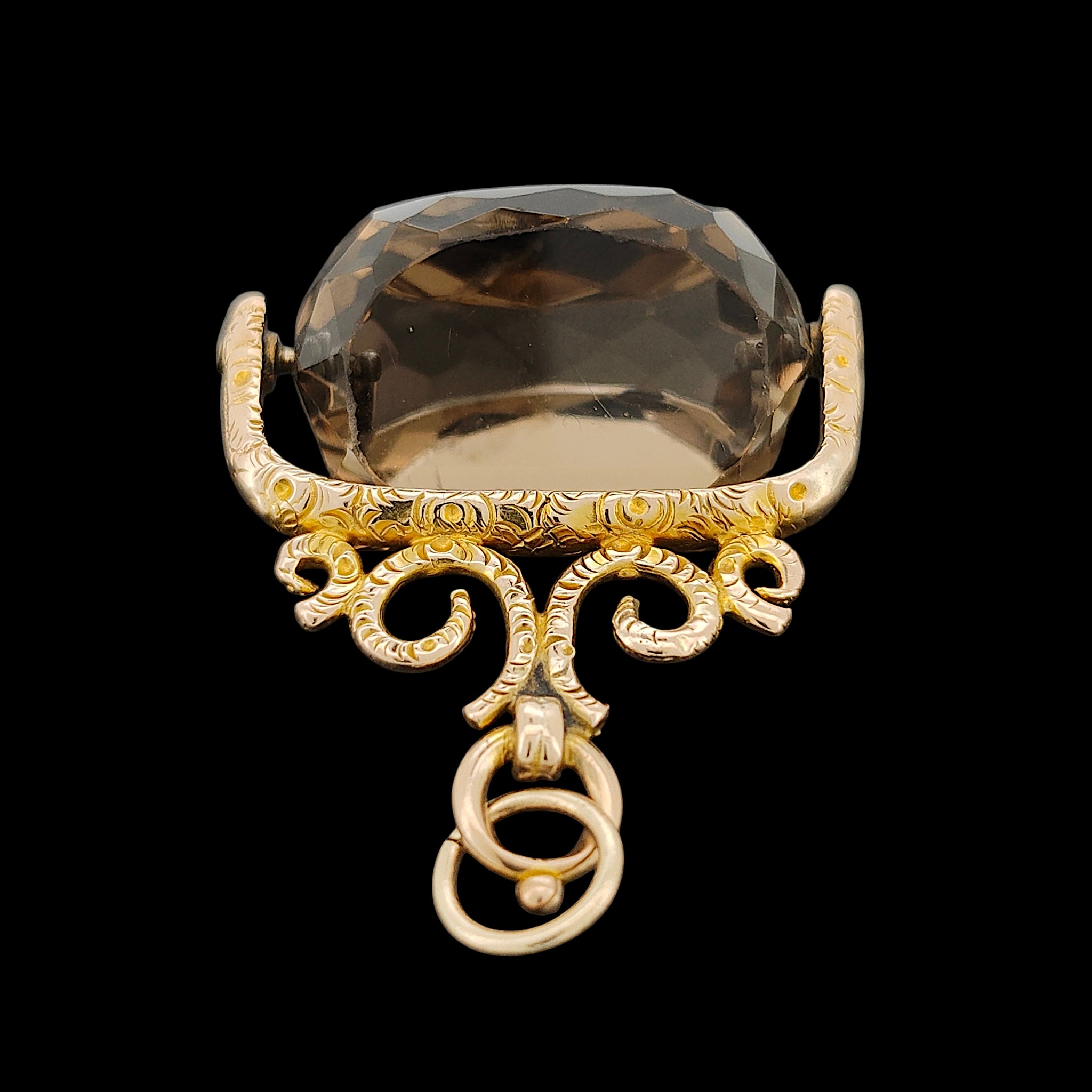 A classic spinning fob from the late Victorian era, originally designed to be attached to a watch chain. The 9 carat yellow gold frame has been beautifully chased. The faceted stone is a smokey quartz and spins in both directions. A new 9 carat gold jump ring has been added by me, allowing it to be worn as a pendant or attached to an Albert chain.