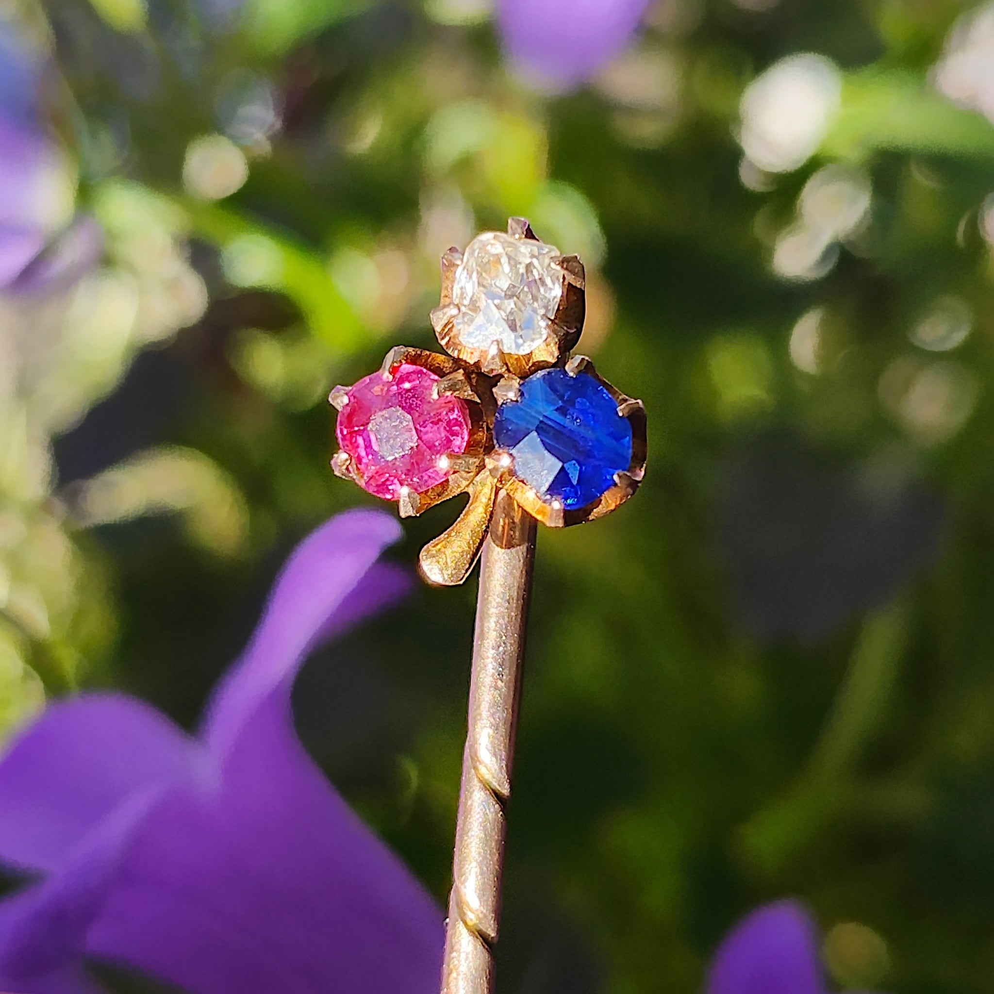 A stunning late Victorian to Edwardian era stick or tie pin, the head featuring an old cut diamond, ruby and sapphire in the shape of a shamrock clover, the stones claw set in 18 carat yellow gold and set upon a 9 carat yellow gold pin. A gorgeous antique piece which can be pinned to the lapel of a jacket, on a tie or almost any piece of clothing.