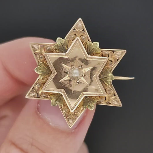 An elegant antique star-shaped brooch with a seed pearl, quintessentially Victorian in style with the two tones of gold, leaf motifs and delicate pierced setting. The brooch is French in origin with the eagle head stamp to the C catch on the back, denoting 18ct purity.