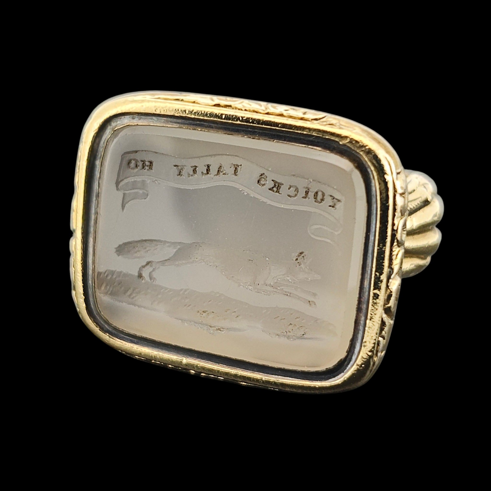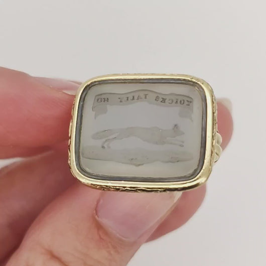 An excellent antique fob seal featuring a cushion-shaped chalcedony face, engraved with a sprinting fox and the phrase "Yoicks Tally Ho" upon a banner, referencing a fox hunt. The body of the seal is cased in 15ct yellow gold with a metal interior (not solid 15ct gold). The word "yoicks" is an exclamation used by fox hunters to spur on the dogs. A beautiful and collectable Victorian piece.