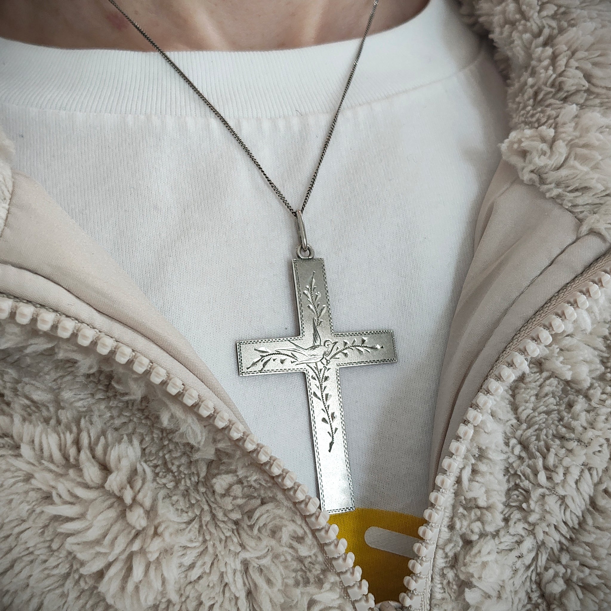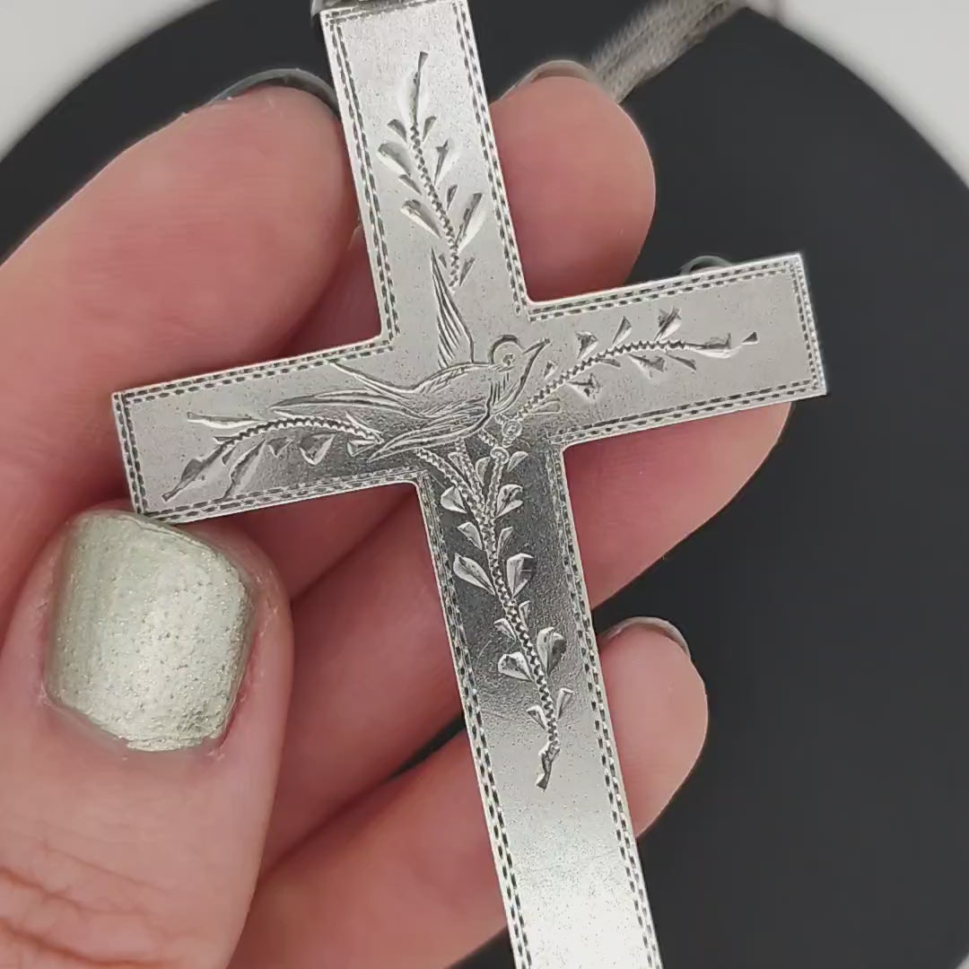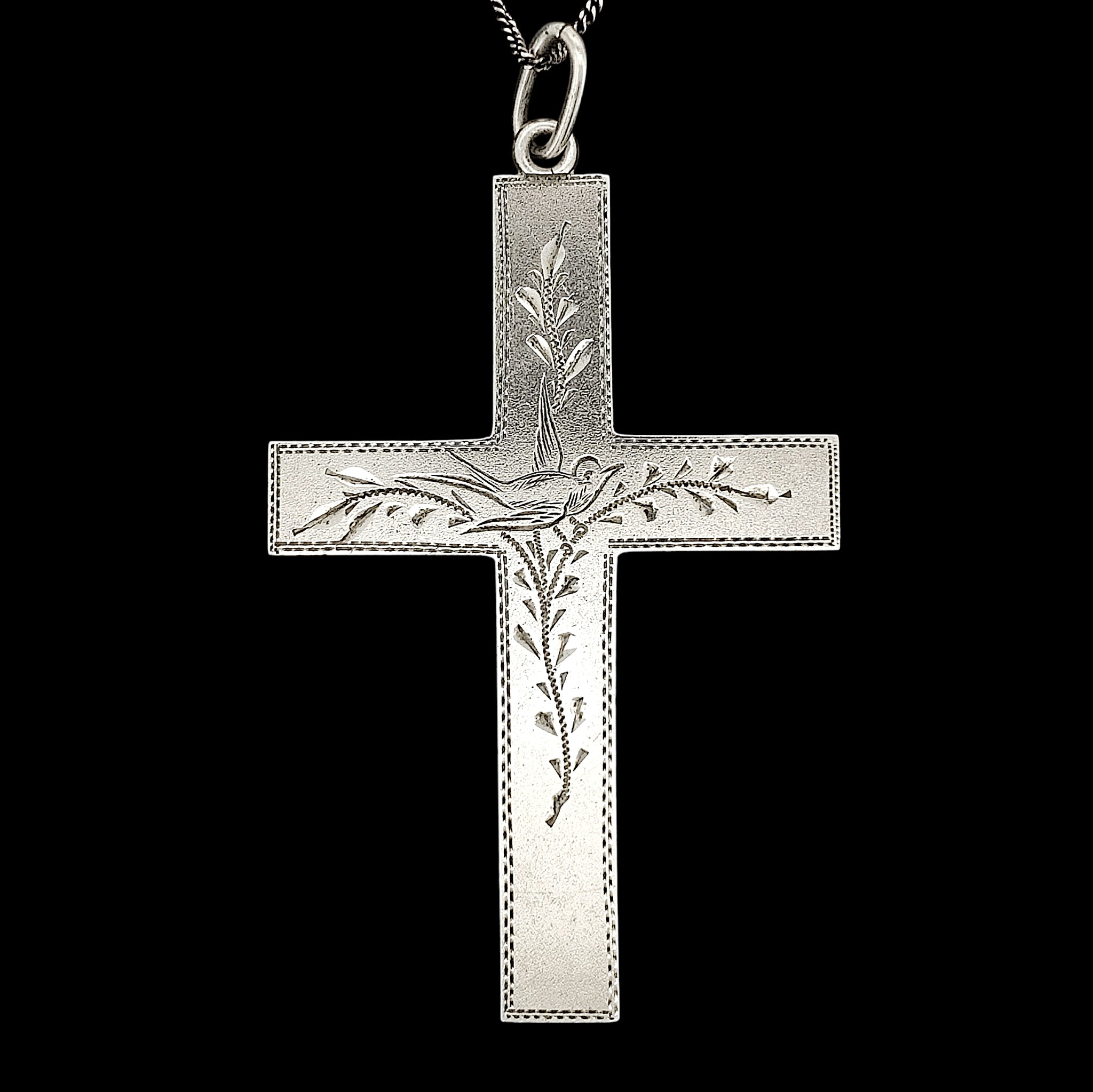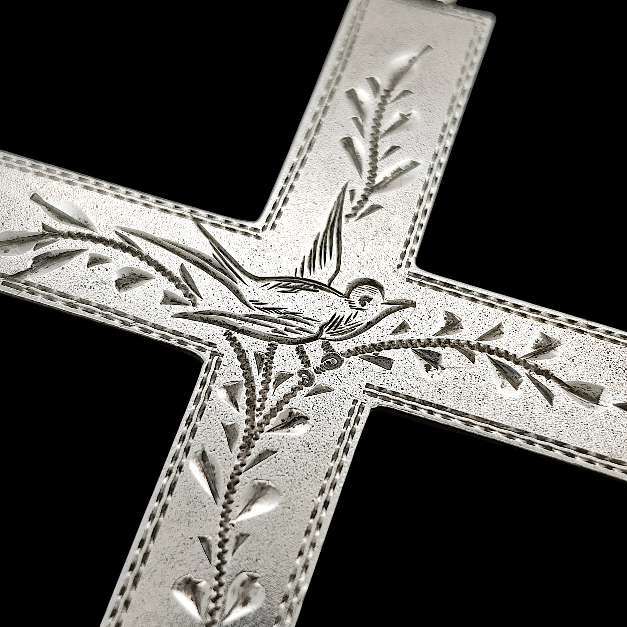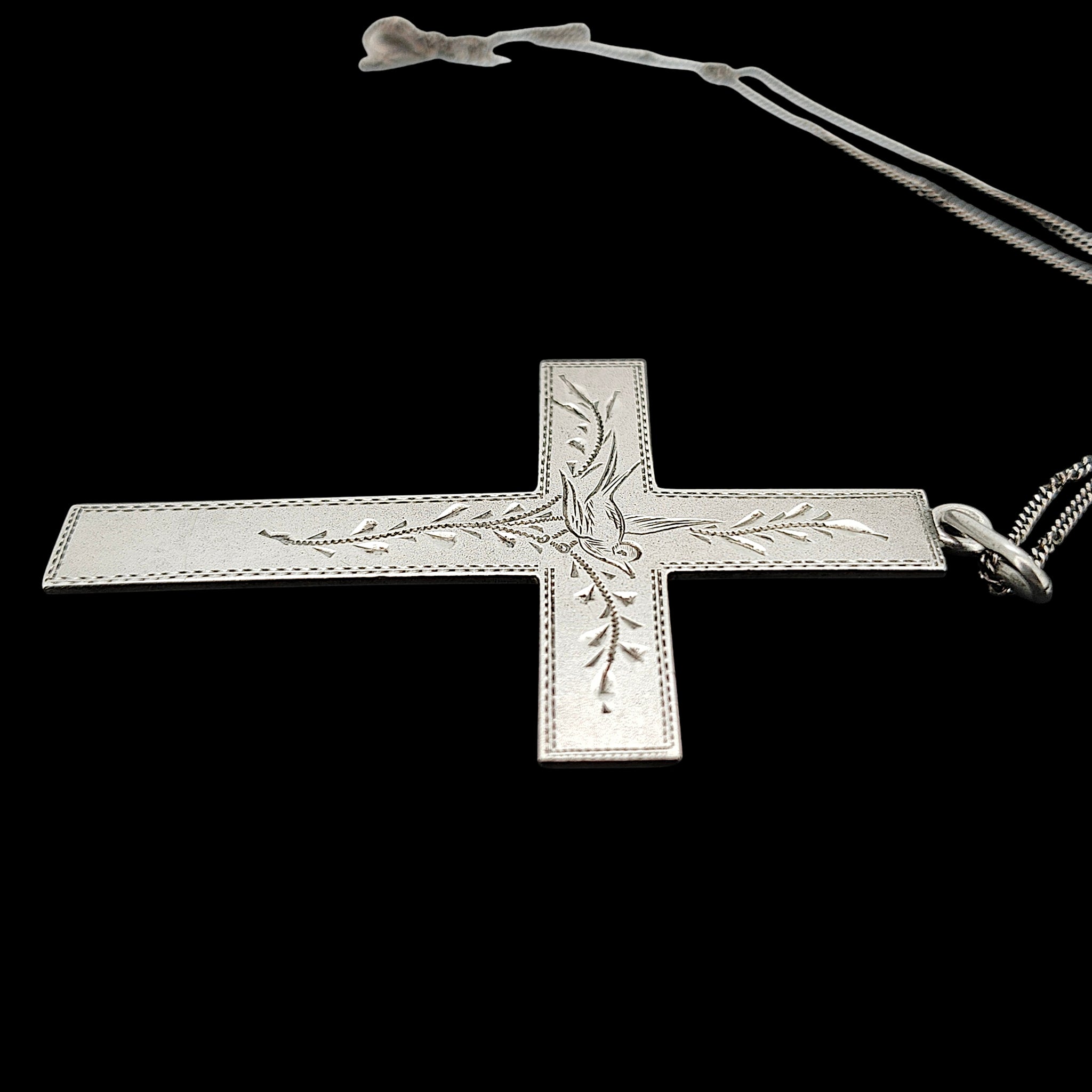 A beautiful and quintessentially Victorian cross pendant, with elegant hand-engraving of a swallow bird in flight, with vine details and a double lined border. The cross is made in 830 standard silver (830/1000) and could be Norwegian. The cross comes paired with a 925 sterling silver fine curb chain, which is a later addition but works perfectly together with the pendant.