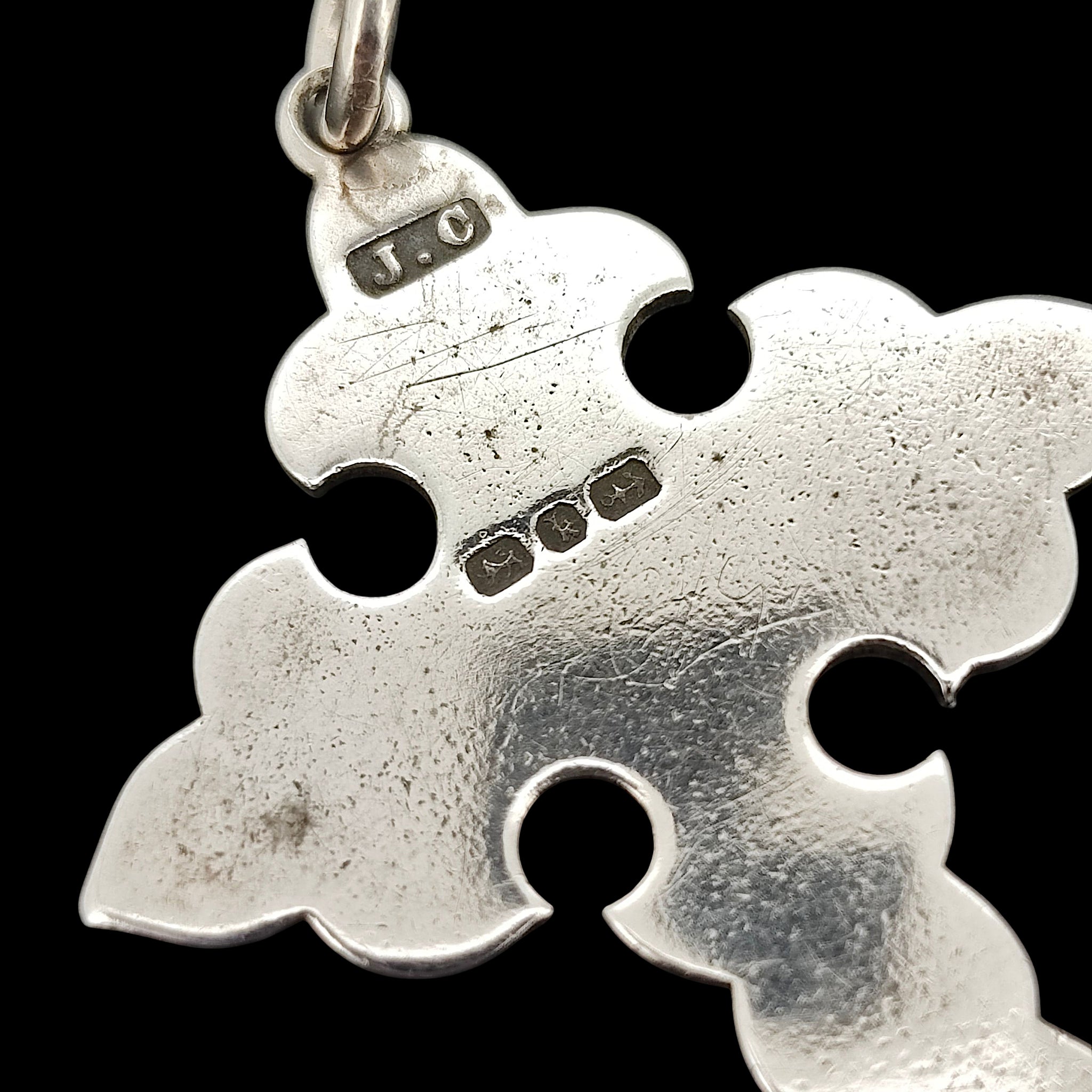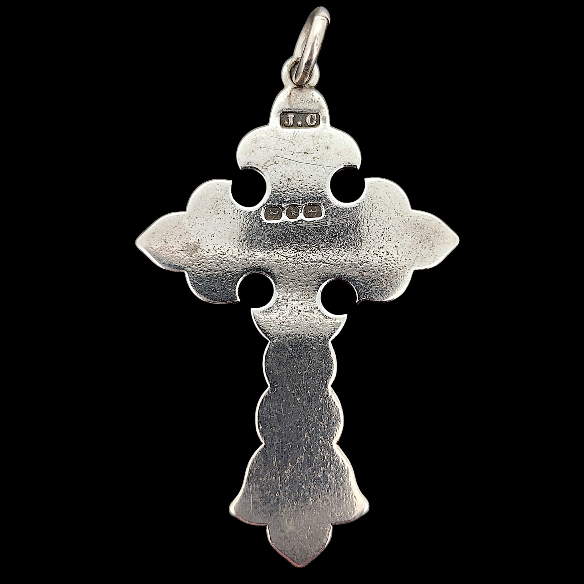 A stunning, large antique cross pendant with scalloped edges, and beautiful ivy leaf engraving to the front. On the reverse is an English hallmark dating the cross to 1884, with the maker's mark of "J.C", likely for Joseph Cook of Carver Street, Birmingham.