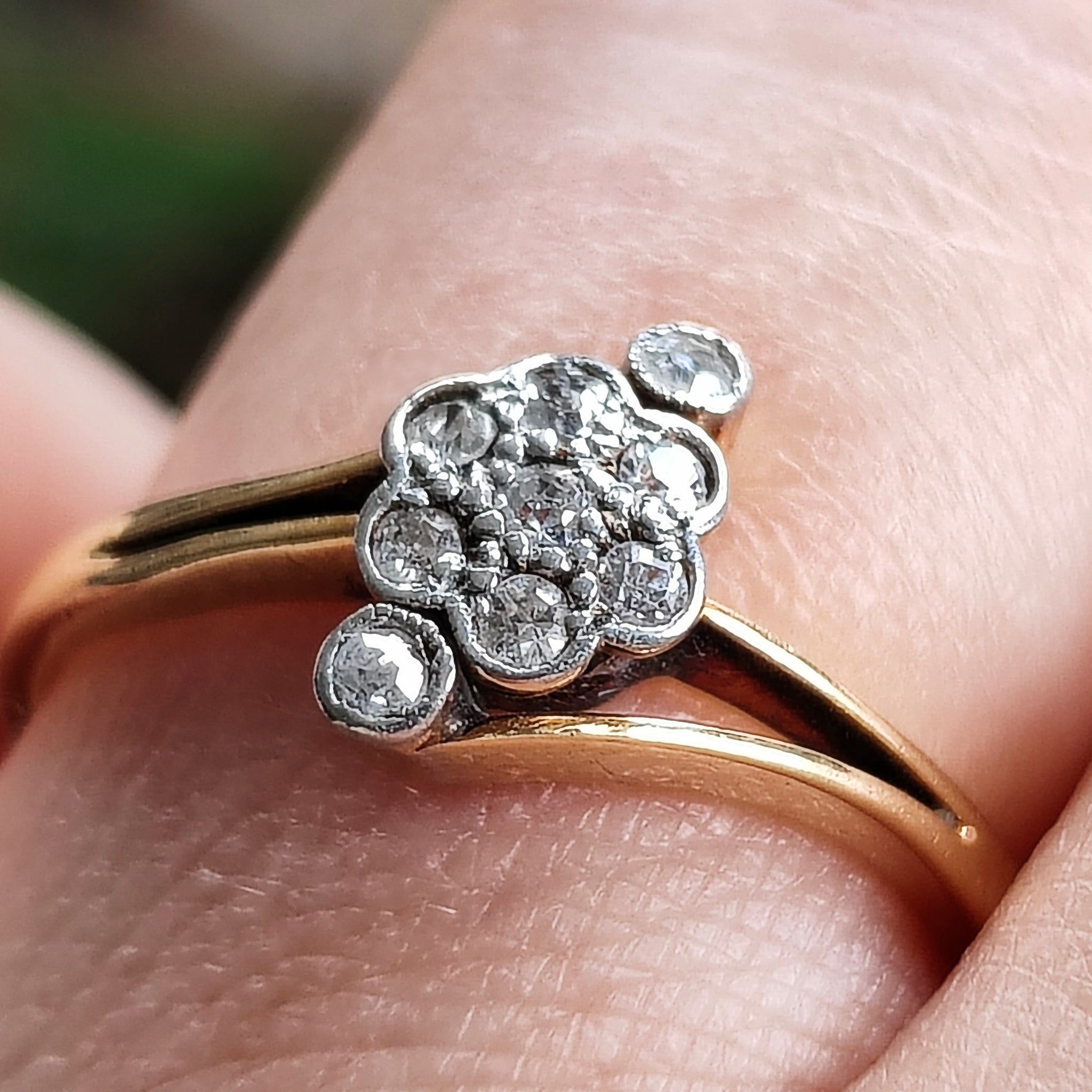 - Art Deco 18ct Yellow Gold and Platinum Diamond Cluster Crossover Ring