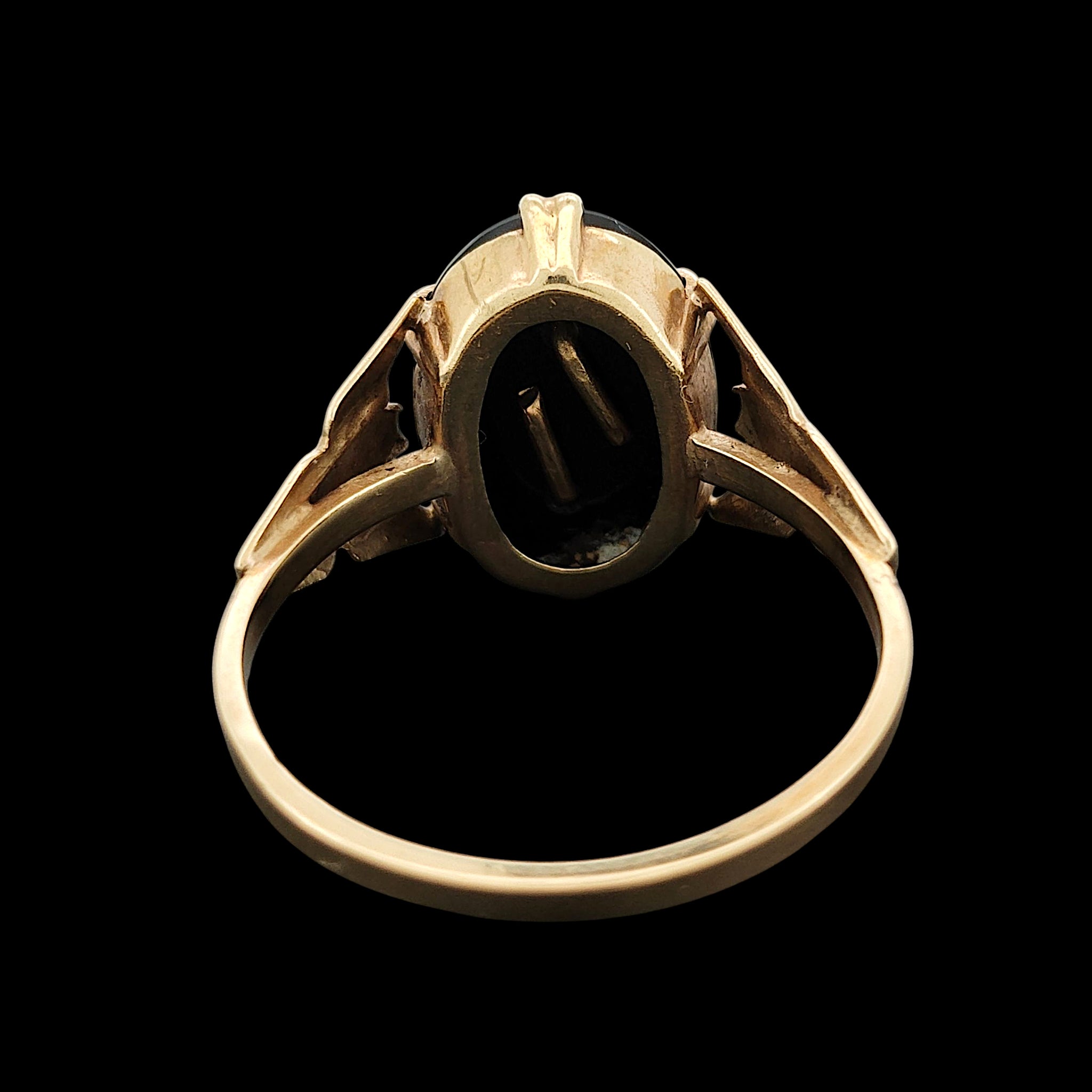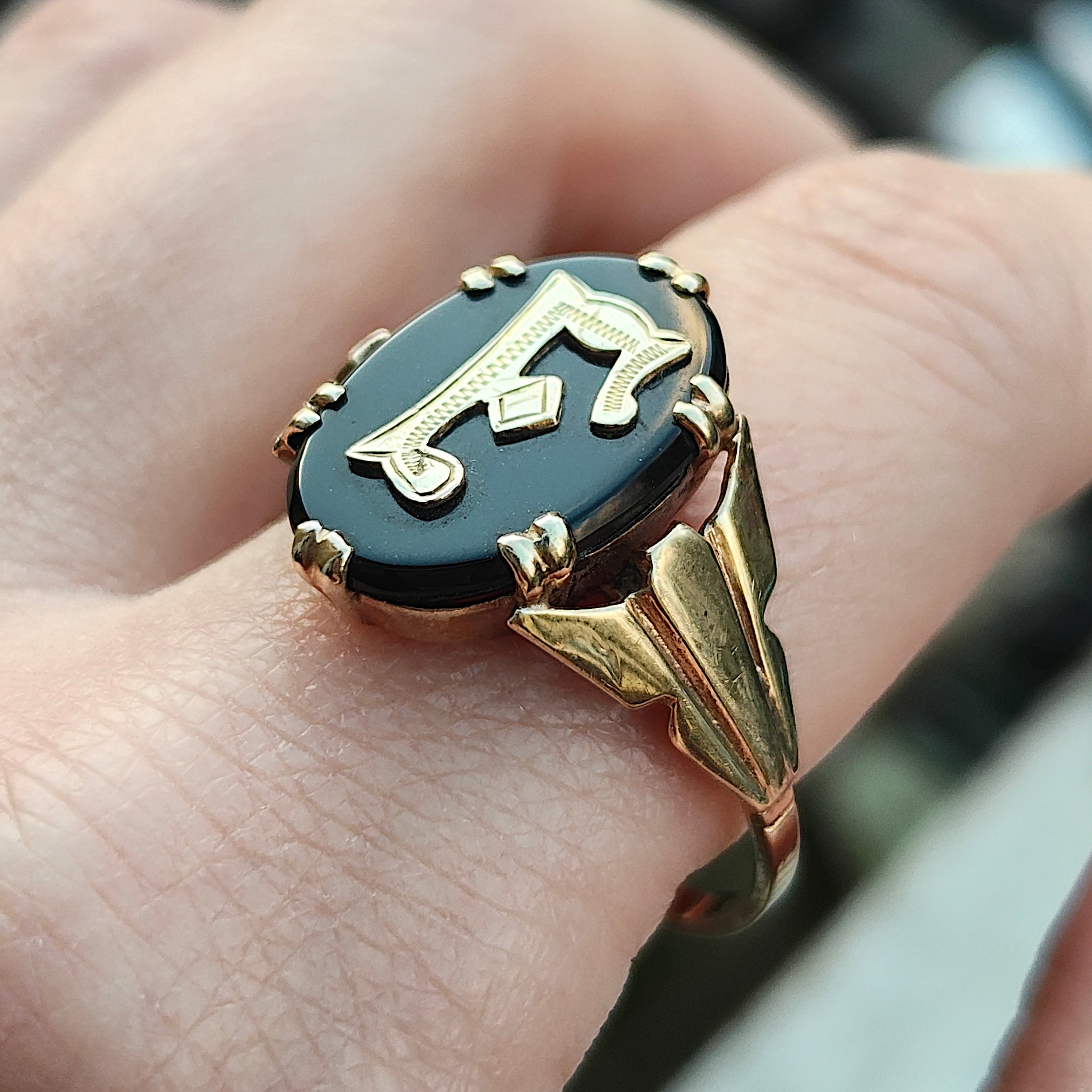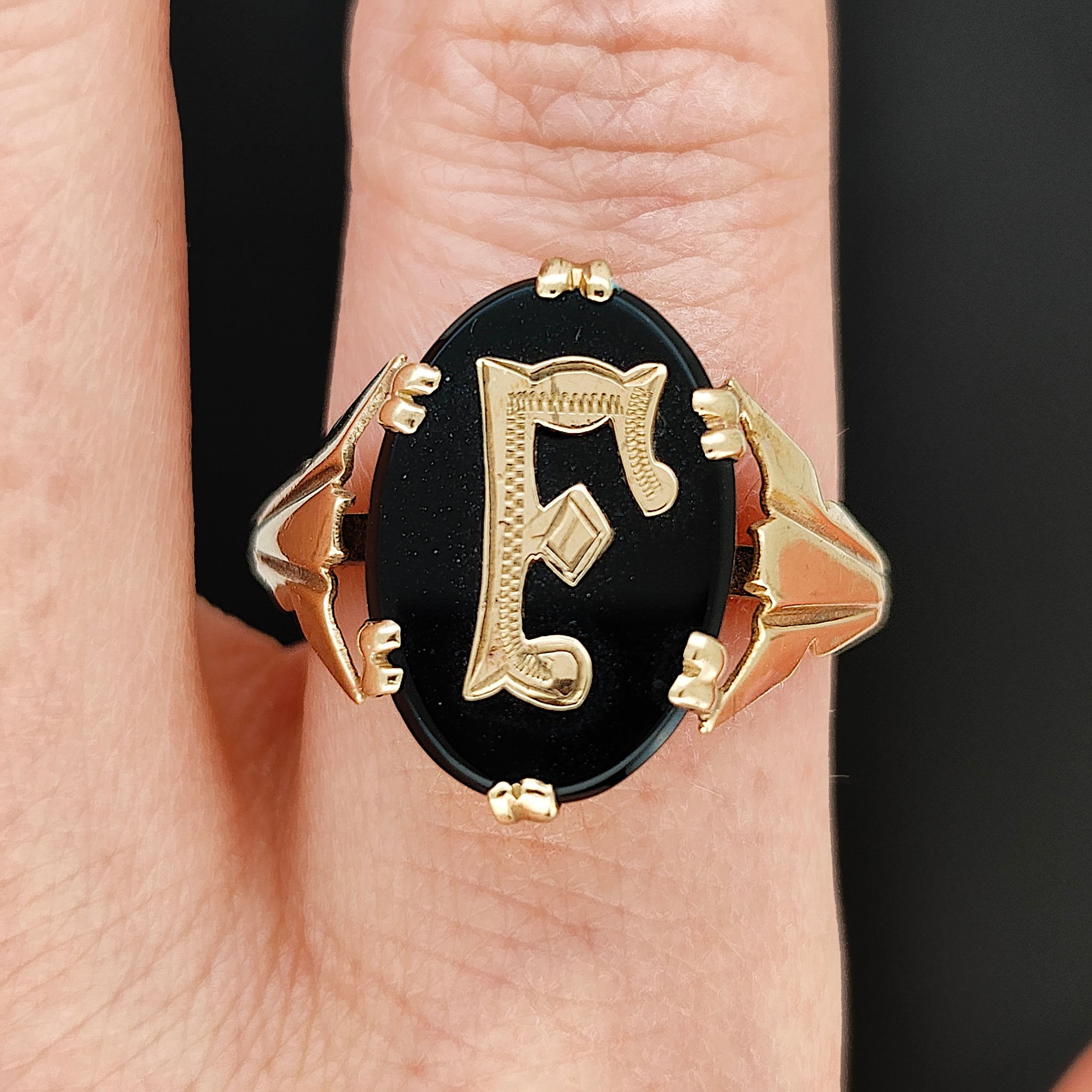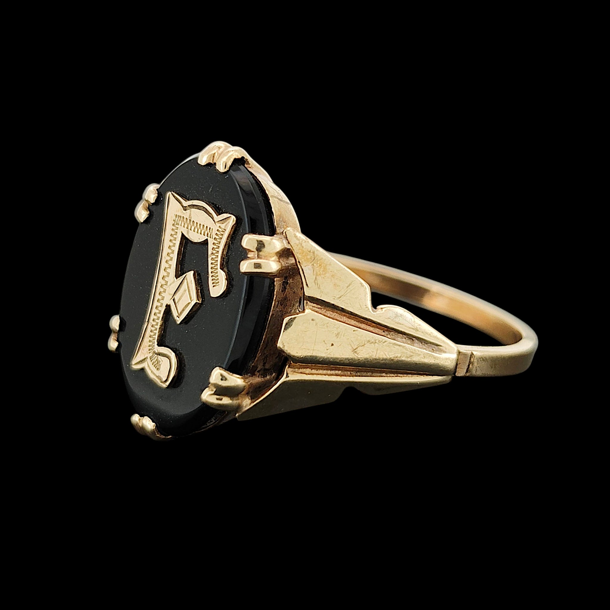 An attractive late Art Deco era ring featuring an oval piece of black onyx, upon which is an applied gold letter "F", the stone set in double claws and mounted upon an attractive 9ct yellow gold shank with wide shoulders. Perfect for those with an "F" name!